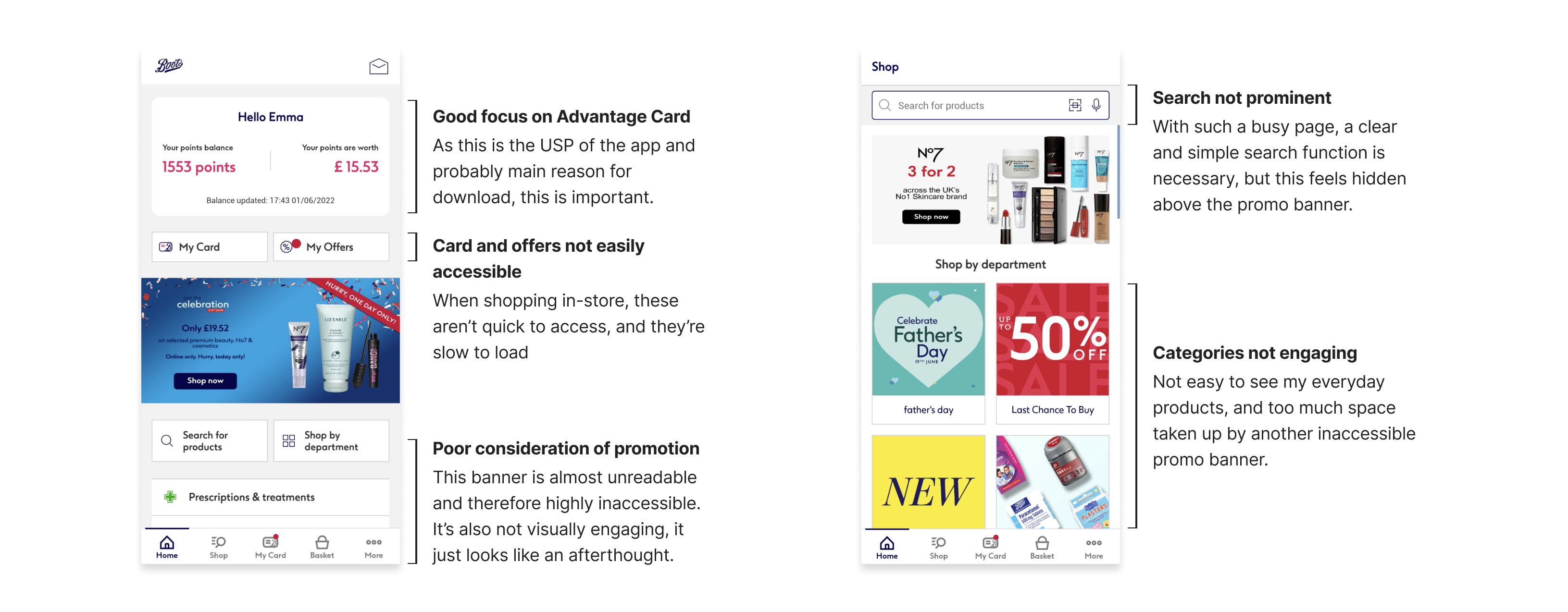Boots' main proposition is their in-store experience, but with decreasing footfall on UK high streets, their app experience needs to match up to this.